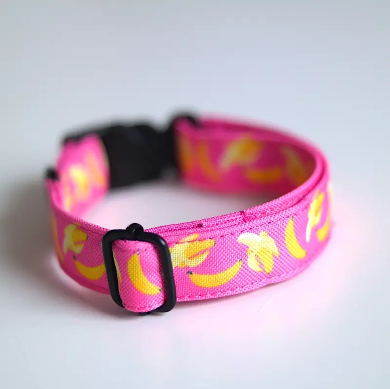 Nasza obroża to nie tylko praktyczny element wyposażenia Twojego psa, ale również wyraz Twojej troski i miłości. Daj swojemu pupilowi to, co najlepsze, i spraw, by czuł się nie tylko wygodnie, ale również wyjątkowo. Wybierz naszą obrożę w kolorze różowym z bananowym wzorem i podkreśl urok swojego psa.